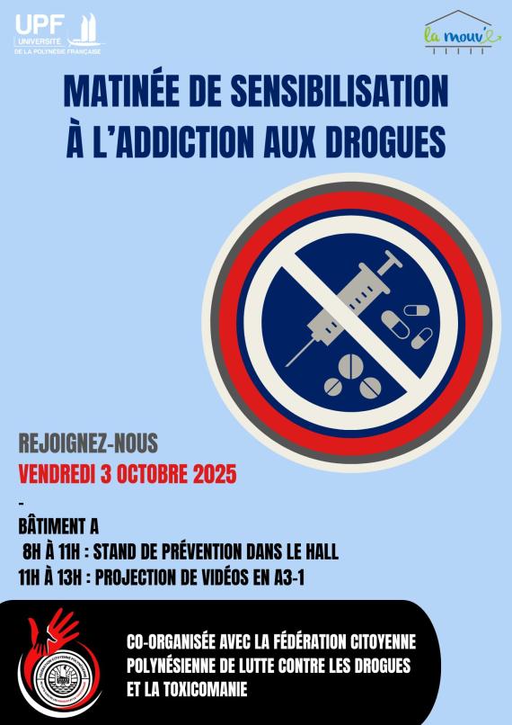 Dans le cadre de ses actions de prévention en milieu universitaire, La Mouve et la Fédération Citoyenne Polynésienne de Lutte contre les Drogues et la Toxicomanie organisent le vendredi 3 octobre 2025 une matinée de sensibilisation à l’addiction aux drogues, à destination des étudiants de l’Université de la Polynésie française.